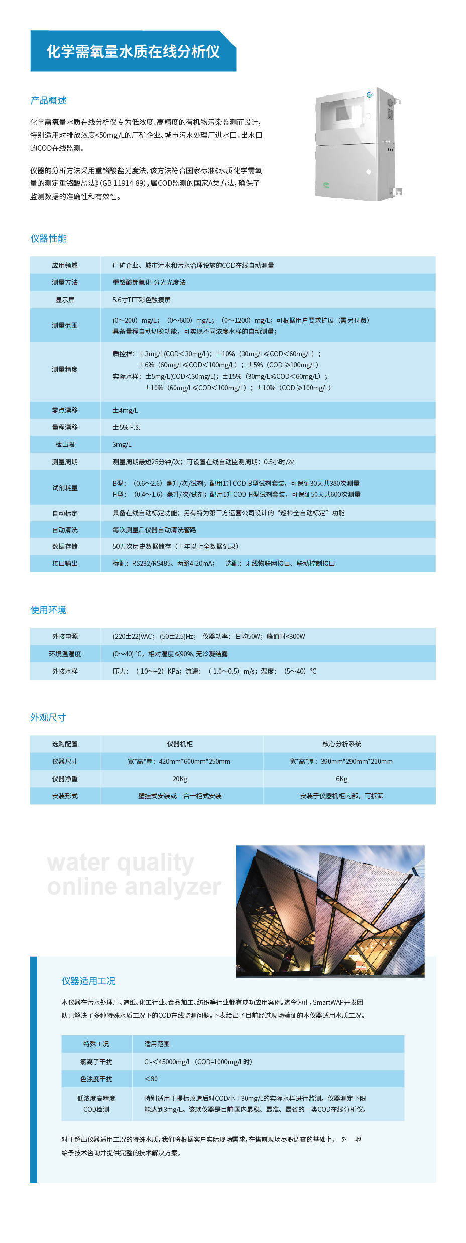 化学需氧量水质在线分析仪专为低浓度、高精度的有机物污染监测而设计,特别适用对排放浓度<50mg/L的厂矿企业、城市污水处理厂进水口、出水口的COD在线监测。仪器的分析方法采用重铬酸盐光度法,该方法符合国家标准《水质化学需氧量的测定重铬酸盐法》(GB 11914-89),属COD监测的国家A类方法,确保了监测数据的准确性和有效性。