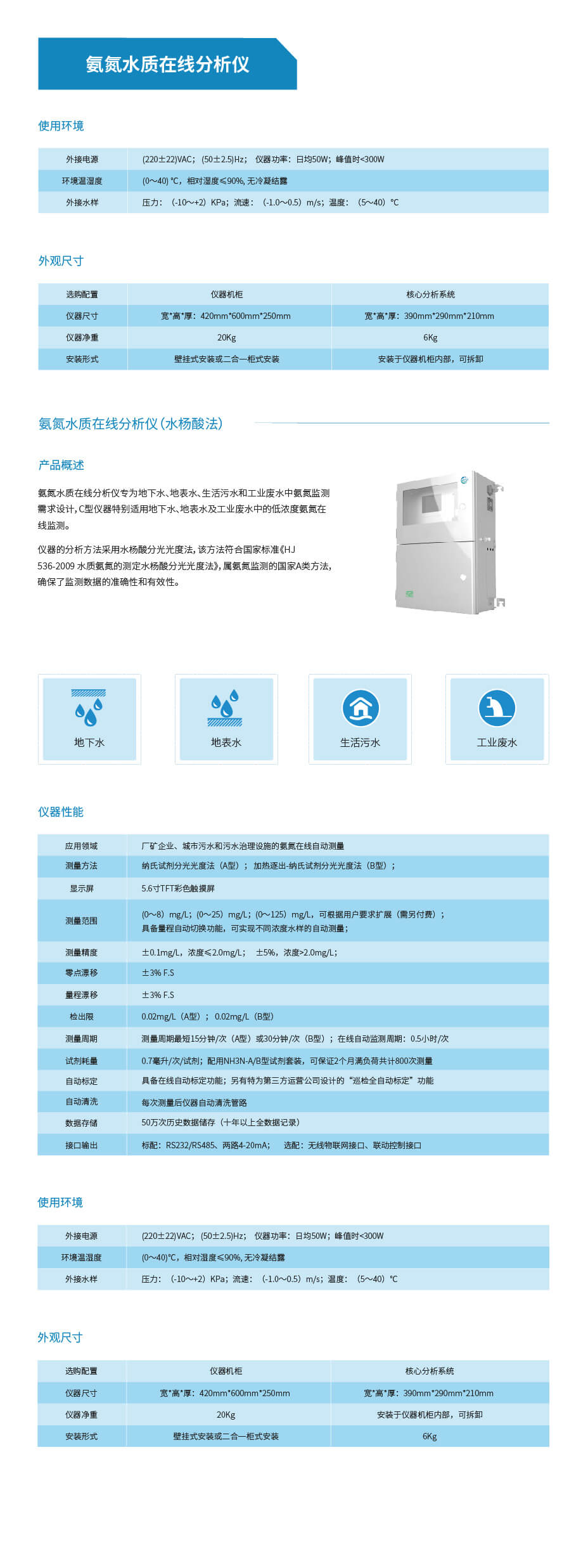 氨氮水质在线分析仪专为污染源水质排放监测需求设计,根据水样预处理的原理不同,又分为A、B型两款仪器。仪器的分析方法采用纳氏试剂分光光度法,该方法符合国家标准《水质氨氮的测定纳氏试剂分光光度法》(HJ 535-2009),属氨氮监测的国家A类方法, 确保了监测数据的准确性和有效性。