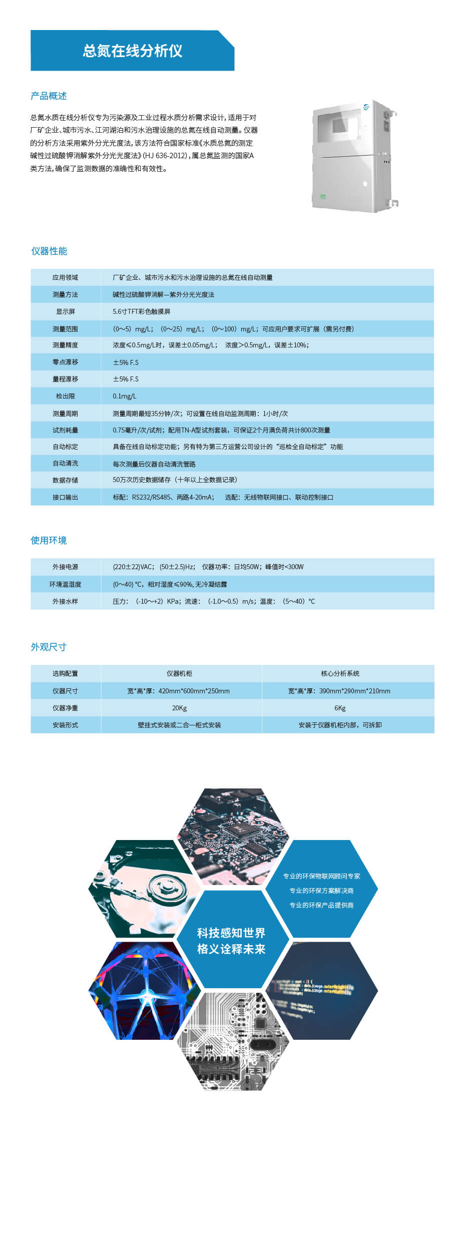 总氮水质在线分析仪专为污染源及工业过程水质分析需求设计,适用于对 厂矿企业、城市污水、江河湖泊和污水治理设施的总氮在线自动测量。 仪器 的分析方法采用紫外分光光度法,该方法符合国家标准《水质总氮的测定 碱性过硫酸钾消解紫外分光光度法》(HJ 636-2012),属总氮监测的国家A 类方法,确保了监测数据的准确性和有效性。