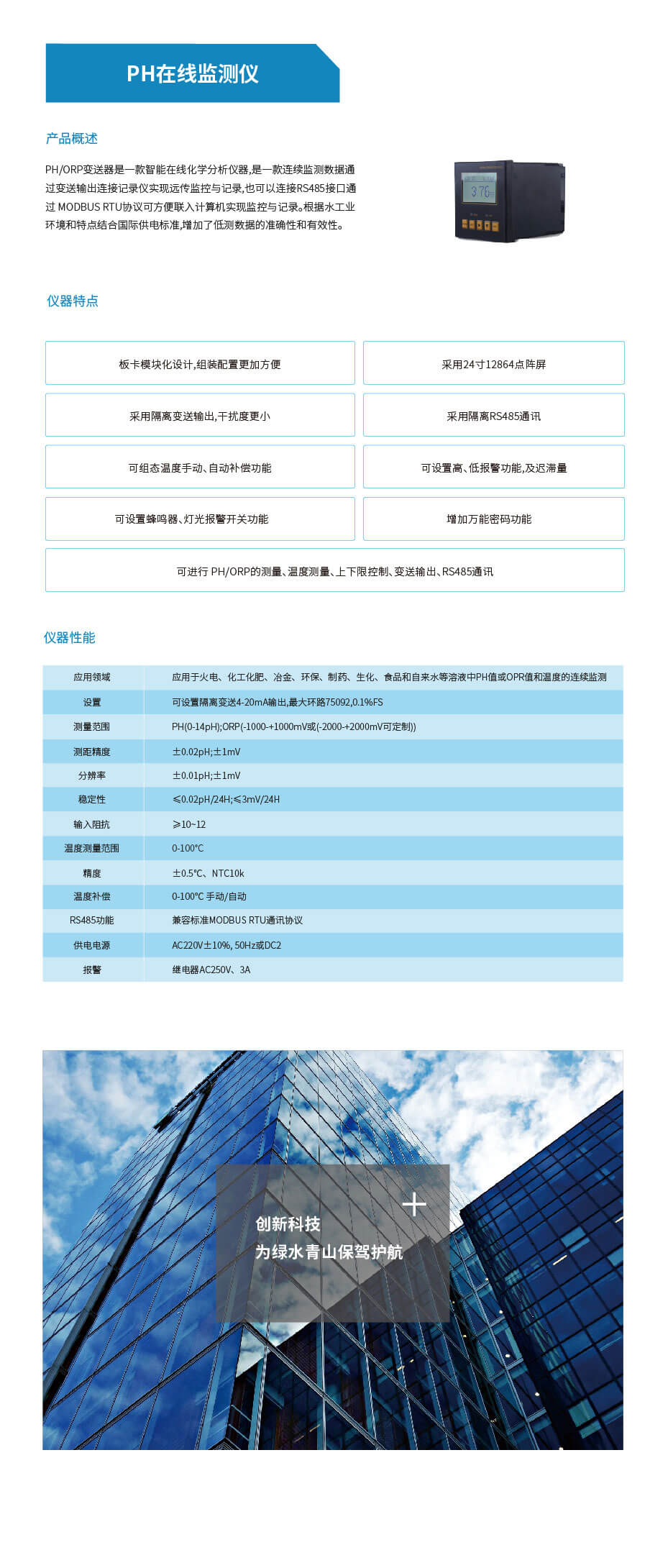 PH/ORP变送器是一款智能在线化学分析仪器,是一款连续监测数据通过变送输出连接记录仪实现远传监控与记录,也可以连接RS485接口通过 MODBUS RTU协议可方便联入计算机实现监控与记录。根据水工业环境和特点结合国际供电标准,增加了低测数据的准确性和有效性。