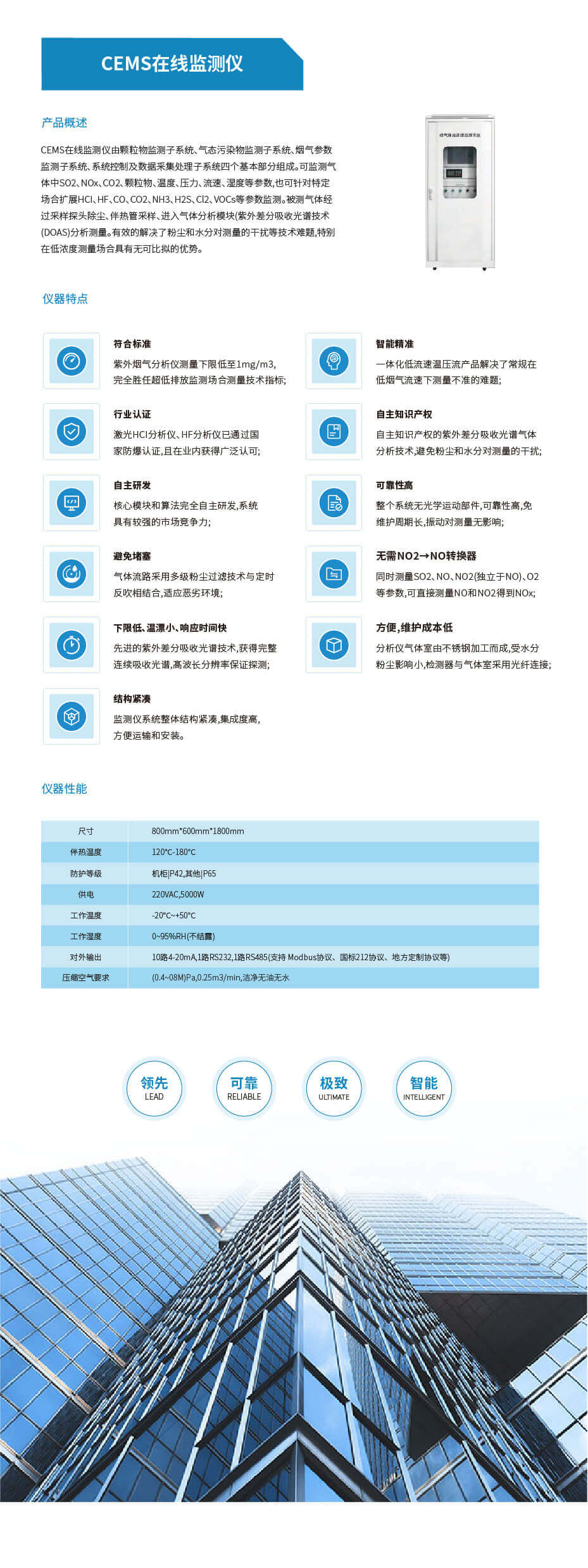 CEMS在线监测仪由颗粒物监测子系统、气态污染物监测子系统、烟气参数监测子系统、系统控制及数据釆集处理子系统四个基本部分组成。可监测气体中SO2、NOx、CO2、颗粒物、温度、压力、流速、湿度等参数,也可针对特定场合扩展HCI、HF、CO、CO2、NH3、H2S、Cl2、VOCs等参数监测。被测气体经过采样探头除尘、伴热管采样、进入气体分析模块(紫外差分吸收光谱技术(DOAS)分析测量。有效的解决了粉尘和水分对测量的干扰等技术难题,特别在低浓度测量场合具有无可比拟的优势。