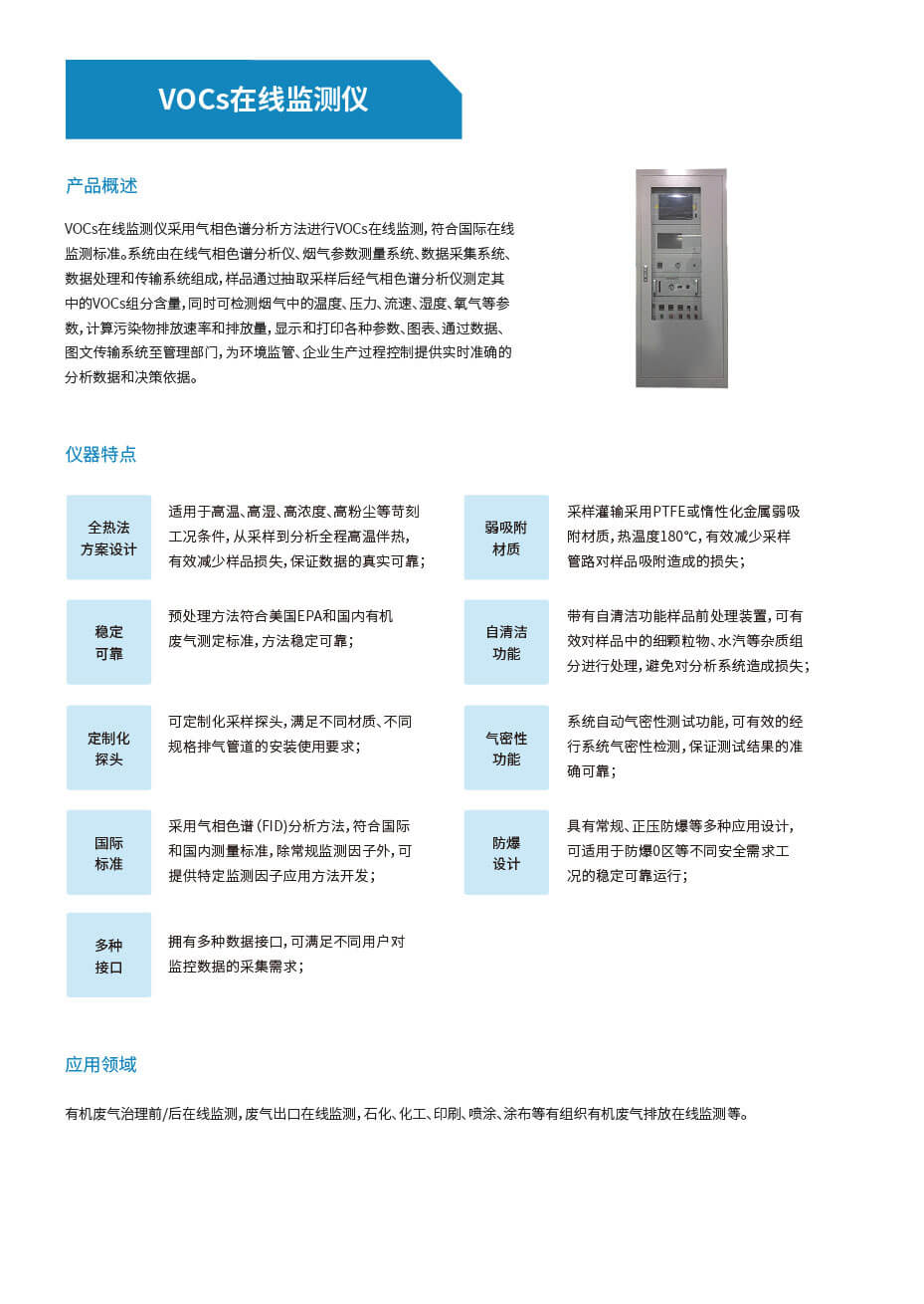 VOCs在线监测仪采用气相色谱分析方法进行VOCs在线监测,符合国际在线监测标准。系统由在线气相色谱分析仪、烟气参数测量系统、数据采集系统、数据处理和传输系统组成,样品通过抽取采样后经气相色谱分析仪测定其中的VOCs组分含量,同时可检测烟气中的温度、压力、流速、湿度、氧气等参数,计算污染物排放速率和排放量,显示和打印各种参数、图表、通过数据、图文传输系统至管理部门,为环境监管、企业生产过程控制提供实时准确的分析数据和决策依据。