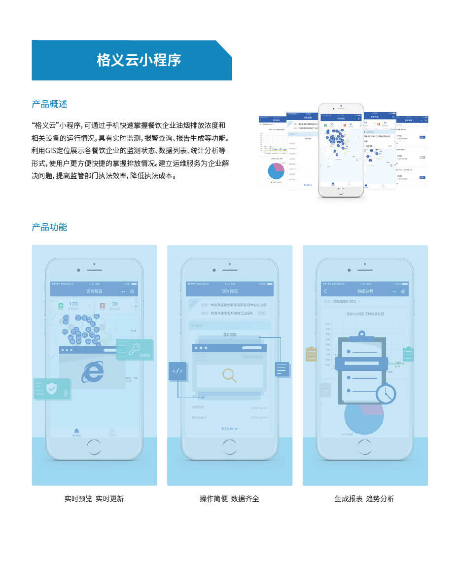 “格义云”小程序,可通过手机快速掌握餐饮企业油烟排放浓度和相关设备的运行情况,具有实时监测,报警查询、报告生成等功能。利用GIS定位展示各餐饮企业的监测状态、数据列表、统计分析等形式,使用户更方便快捷的掌握排放情况。建立运维服务为企业解决问题,提高监管部门执法效率,降低执法成本。